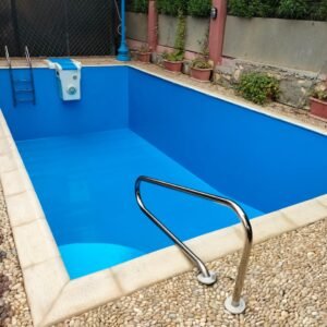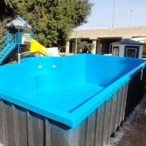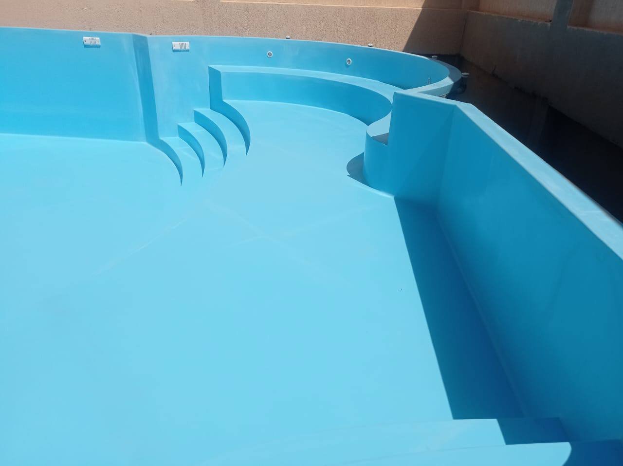 - حمام سباحة مصنع من مادة الفيبر جلاس المسلح بالالياف الزجاجية المدهون بمادة الجليكوت الملساء التى تتحمل قلوية المياه