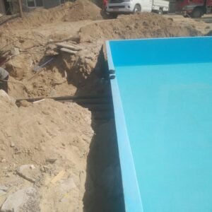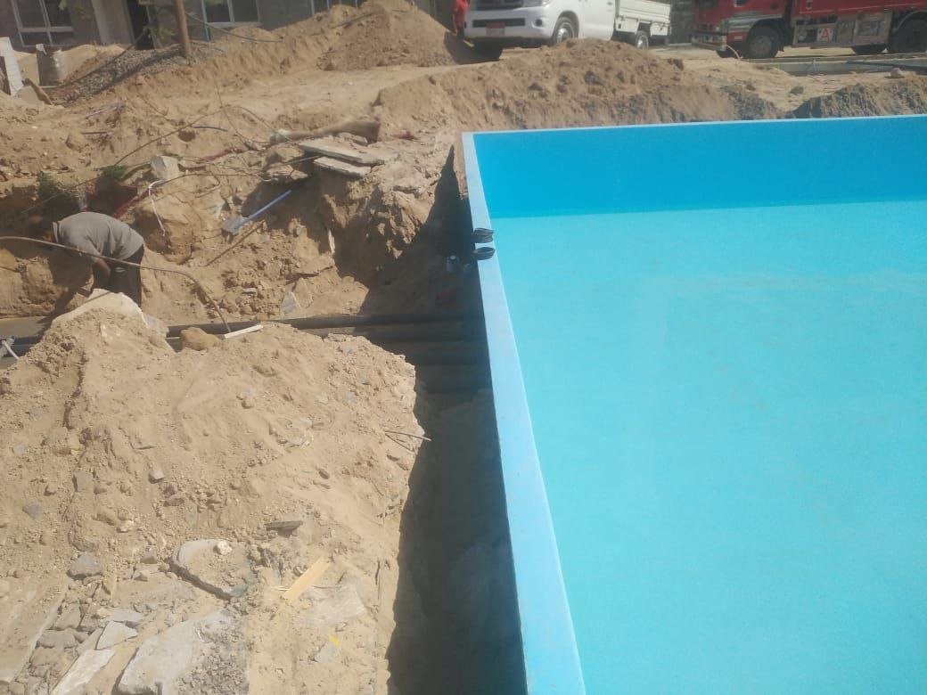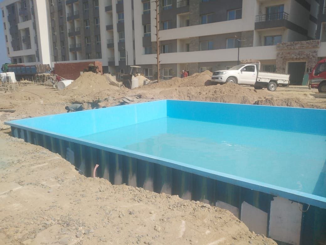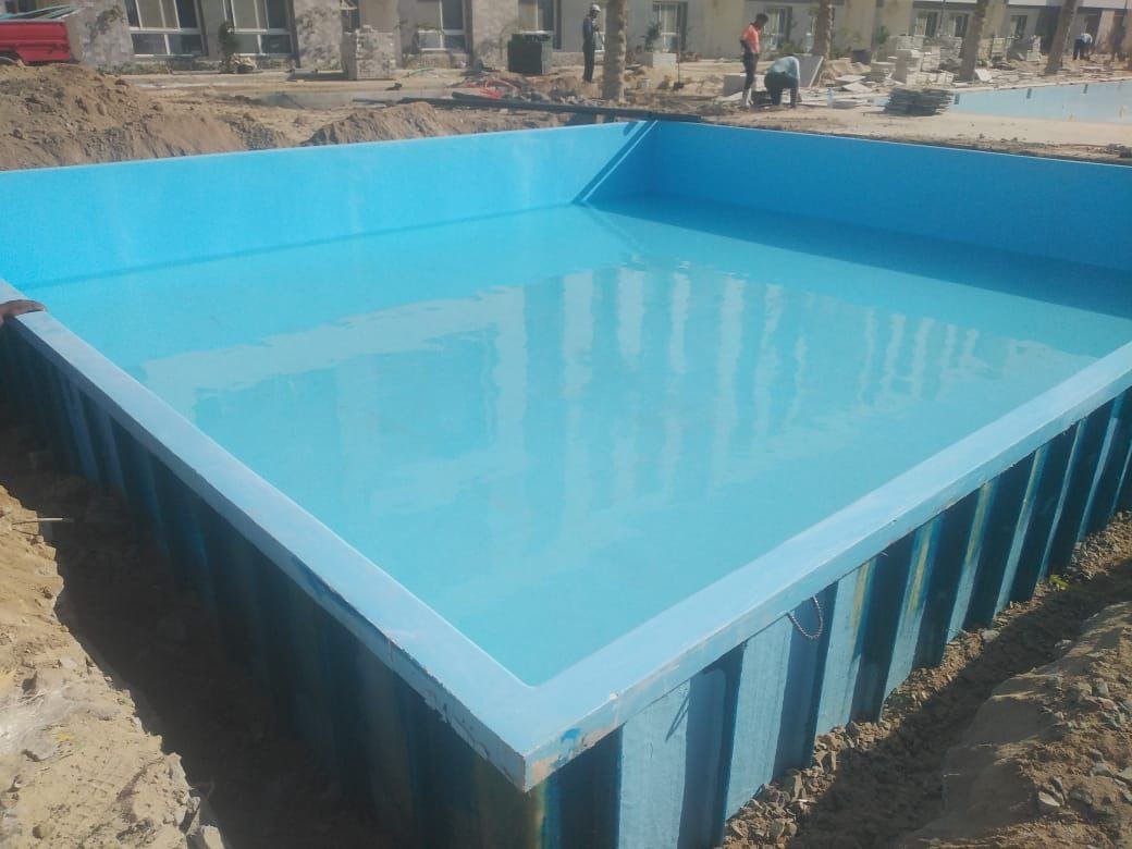 - حمام سباحة مصنع من مادة الفيبر جلاس المسلح بالالياف الزجاجية المدهون بمادة الجليكوت الملساء التى تتحمل قلوية المياه
